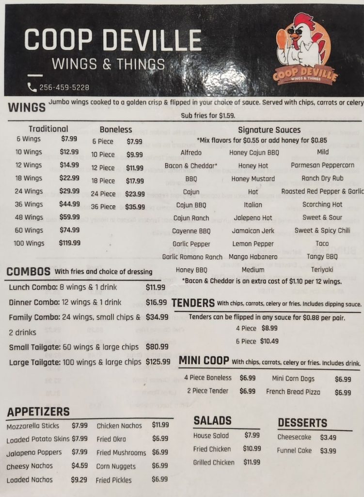 Excellent food,large wings,Excellent flavor,and the fries are awesome,this is the first time I’ve eaten at a coop deville,and I can say it better than any other wing place in Gadsden or surrounding area. And our waitress was friendly,Excellent service,everyone was on top of their game. A+ See you all again soon.