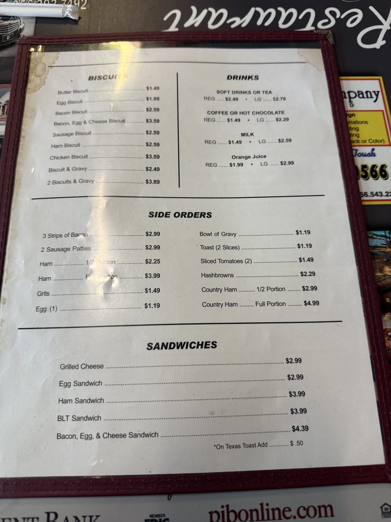This is the epitomy of a Southern Eatery. Atmosphere, simple…….my breakfast was exactly what I expected, so good. My server was awesome. Very attentive but not overly so. I highly recommend 278 for a truly good Southern experience.